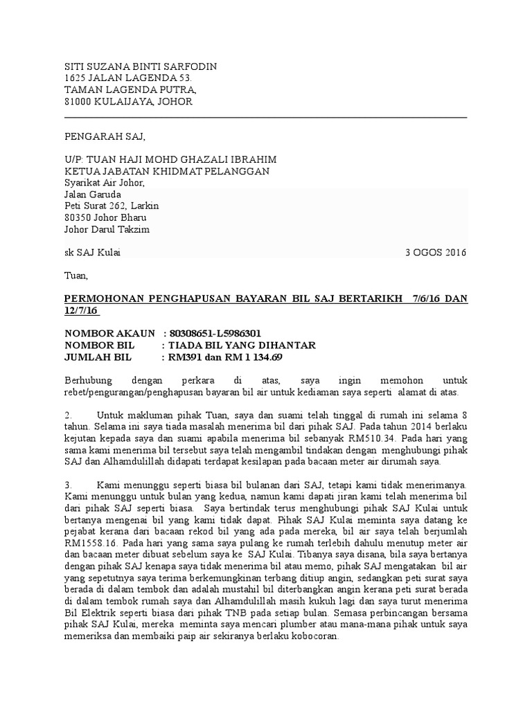 Contoh Surat Rayuan Pengurangan Bayaran Bil Air - Saya durin anak uchop ingin menarik perhatian pihak tuan sebelum ini saya, bayaran bil air saya tidak pernah melebihi rm20 sebulan.