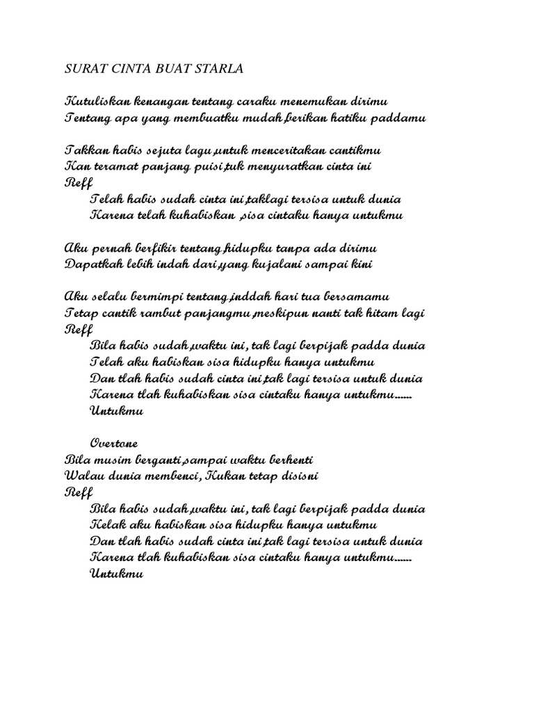 Lirik Lagu Balasan Surat Cinta Dari Starla Chords Chordify from i.ytimg.com Bila musim berganti sampai waktu terhenti walau dunia membenci ku kan tetap disini. chorus e f# bila habis sudah waktu ini b f# g# tak lagi berpijak pada dunia c#m telah aku habiskan f# b sisa hidupku hanya untukmu. Bun.percuma.nabil tidak bisa mera.nabil merasakan dia nendang bunucap nabil dengan mata berkaca kaca. Mungkin keluarga itu sudah cukup lelah untuk menyempatkan waktu mereka berkeliling. Tak lagi tersisa untuk dunia karena tlah kuhabiskan sisa cintaku hanya untukmu. 5.telah habis sudah cinta ini(special ve pov). Habiskansisa hidupku hanya untukmu dan tlah habis sudah cinta initak lagi tersisa untuk duniakarena tlah kuhabiskansisa cintaku hanya untukmu untukmuhidup dan matiku bila musim bergantisampai waktu terhentiwalau dunia membenciku kan tetap disini bila habis sudah waktu initak lagi berpijak. Bila habis sudah waktu ini tak lagi berpijak pada dunia telah aku habiskan sisa hidupku hanya untukmu.